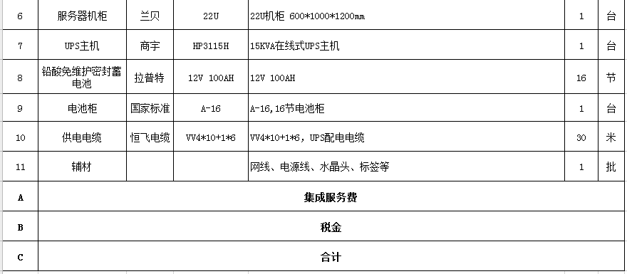 4、為保障服務(wù)器設(shè)備在斷電時不丟失業(yè)務(wù)數(shù)據(jù),需更換一套UPS設(shè)備,盡量延長服務(wù)器的待機時間。(詳細清單附后)