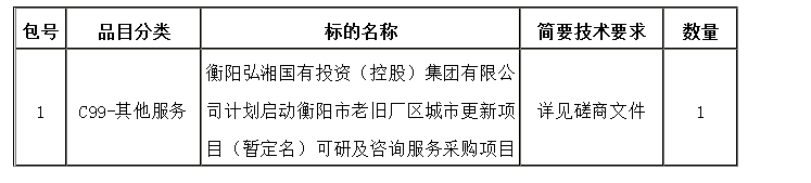 采購(gòu)項(xiàng)目名稱:衡陽(yáng)弘湘國(guó)有投資(控股)集團(tuán)有限公司計(jì)劃啟動(dòng)衡陽(yáng)市老舊廠區(qū)城市更新項(xiàng)目(暫定名)可研及咨詢服務(wù)采購(gòu)項(xiàng)目