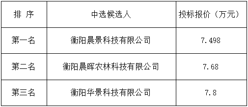衡陽市2023年度十六、十七批次建設(shè)用地項(xiàng)目采伐作業(yè)設(shè)計(jì)服務(wù)單位比選于2023年7月18日上午9時(shí)00分(北京時(shí)間)進(jìn)行了比選開標(biāo)、評(píng)標(biāo)活動(dòng),評(píng)標(biāo)委員會(huì)按照比選文件規(guī)定的評(píng)標(biāo)辦法及原則進(jìn)行評(píng)定,推薦中選候選人排名如下: