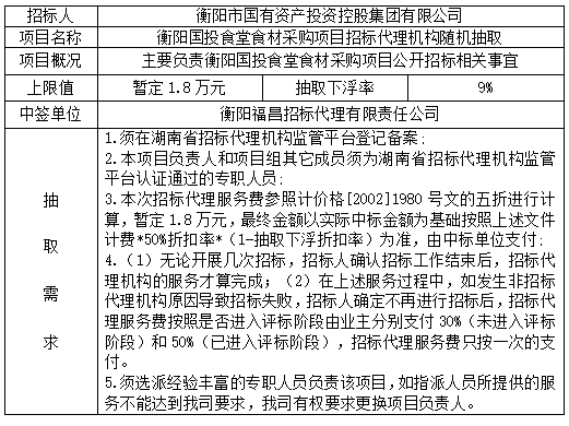 衡陽(yáng)國(guó)投食堂食材采購(gòu)項(xiàng)目招標(biāo)代理機(jī)構(gòu)隨機(jī)抽取結(jié)果公示